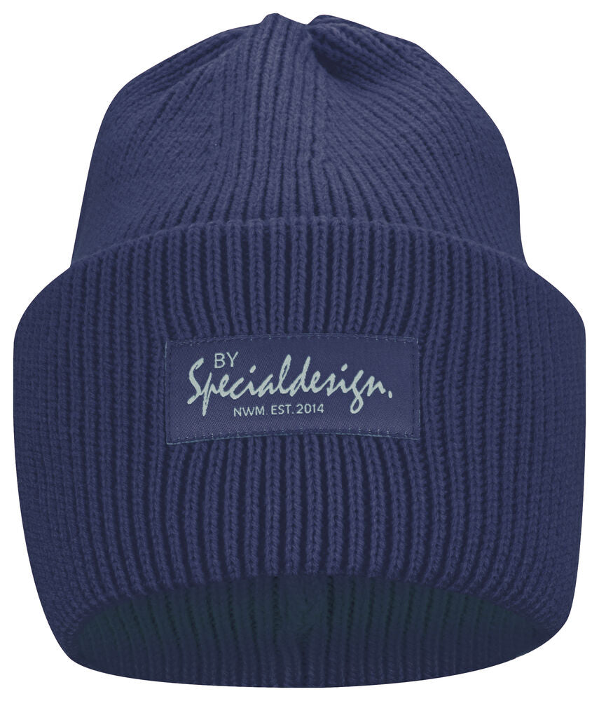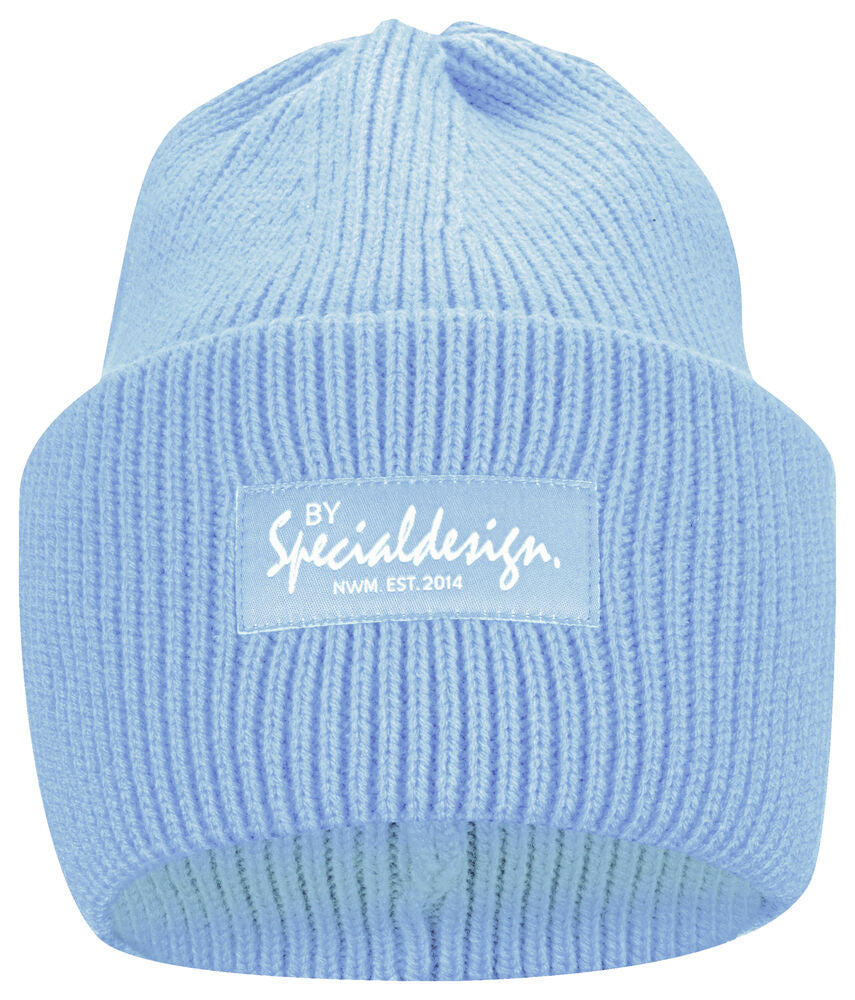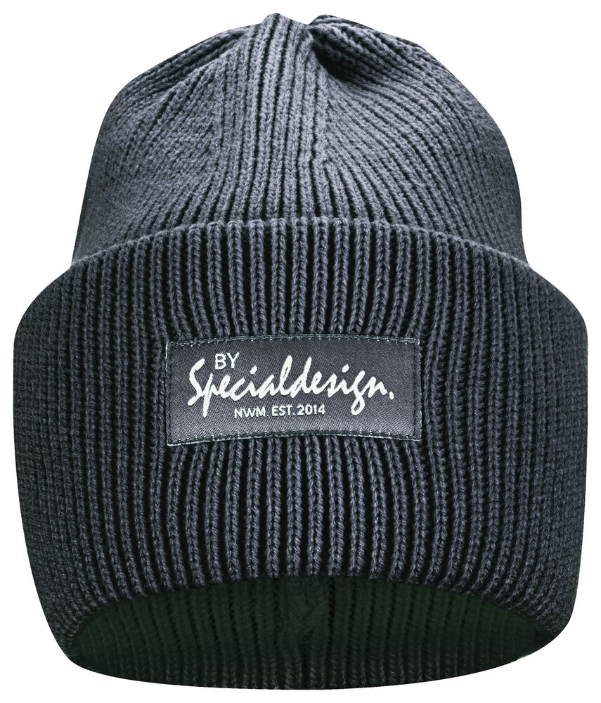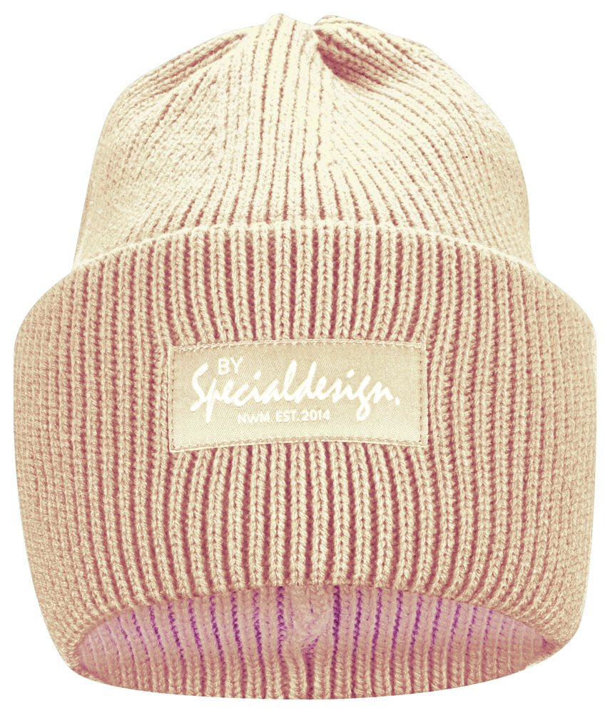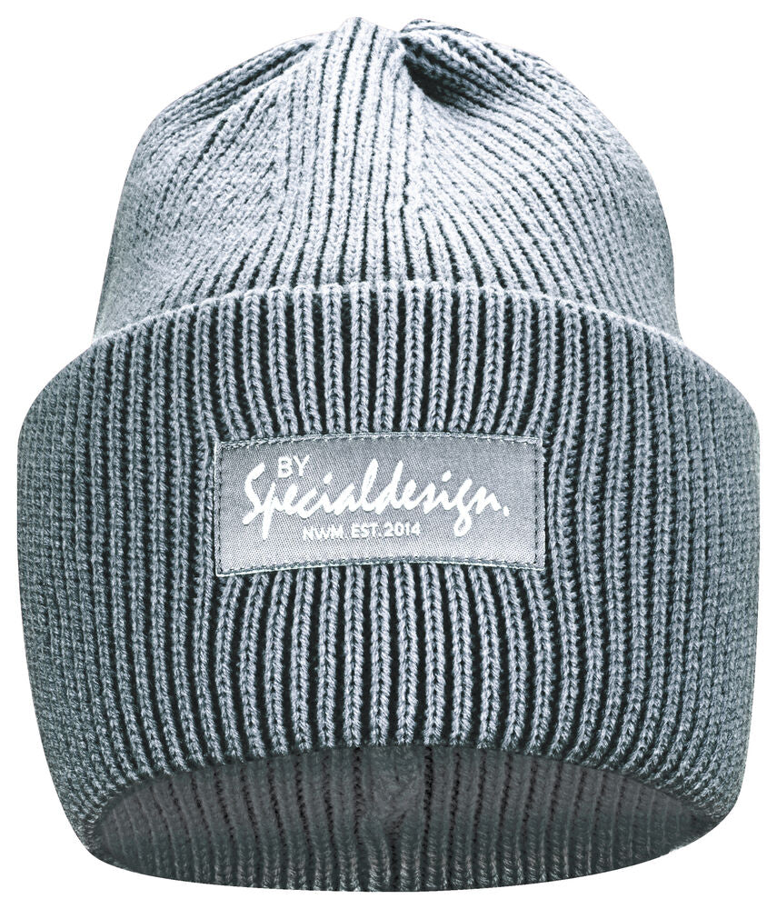 Kraftig, enkelstickad mössa i akryl med smala ribbor. Högt uppvik i dubbelt lager och 4 dekorativa sömmar i toppen. Mått: B25xH23 cm, uppvik: 11cm. Pris inkl. en brodyr* alt. en vävd etikett*.