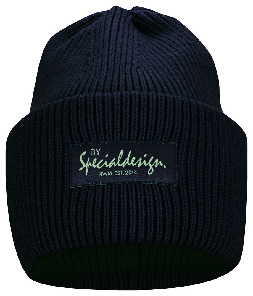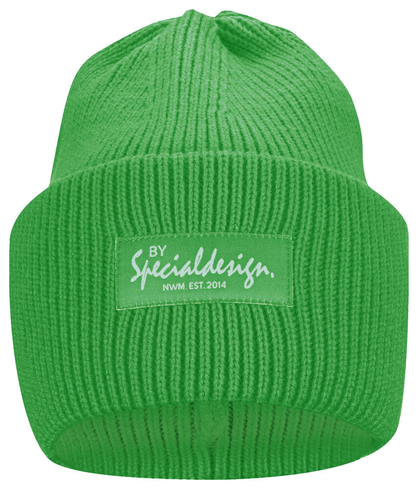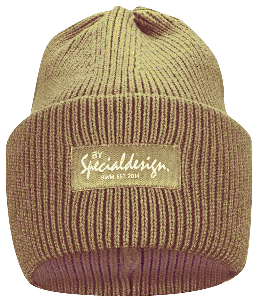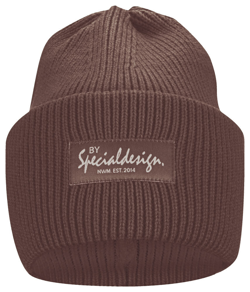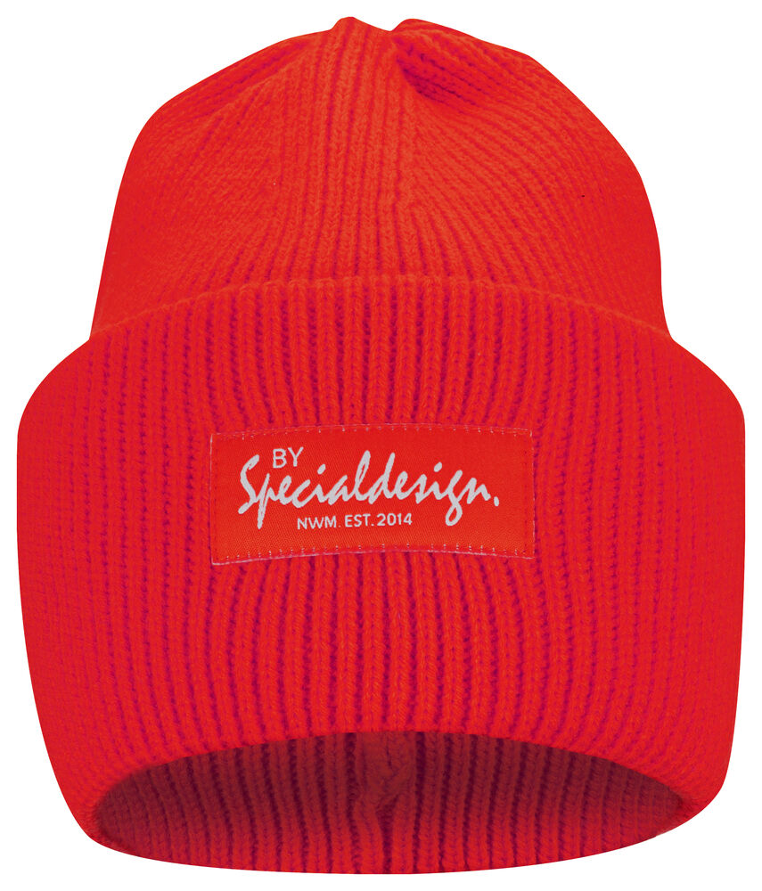 Kraftig, enkelstickad mössa i akryl med smala ribbor. Högt uppvik i dubbelt lager och 4 dekorativa sömmar i toppen. Mått: B25xH23 cm, uppvik: 11cm. Pris inkl. en brodyr* alt. en vävd etikett*.