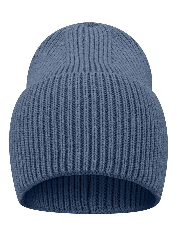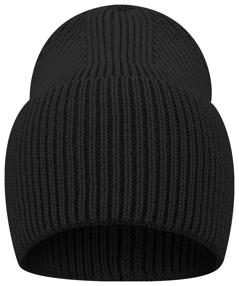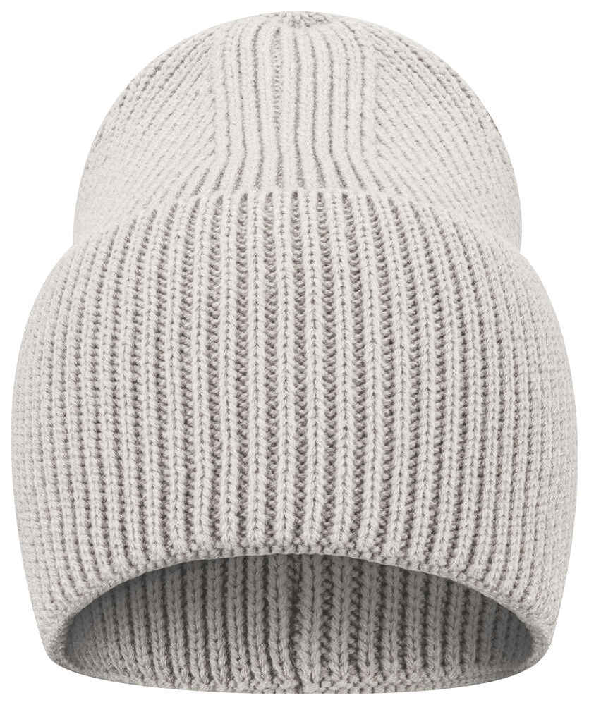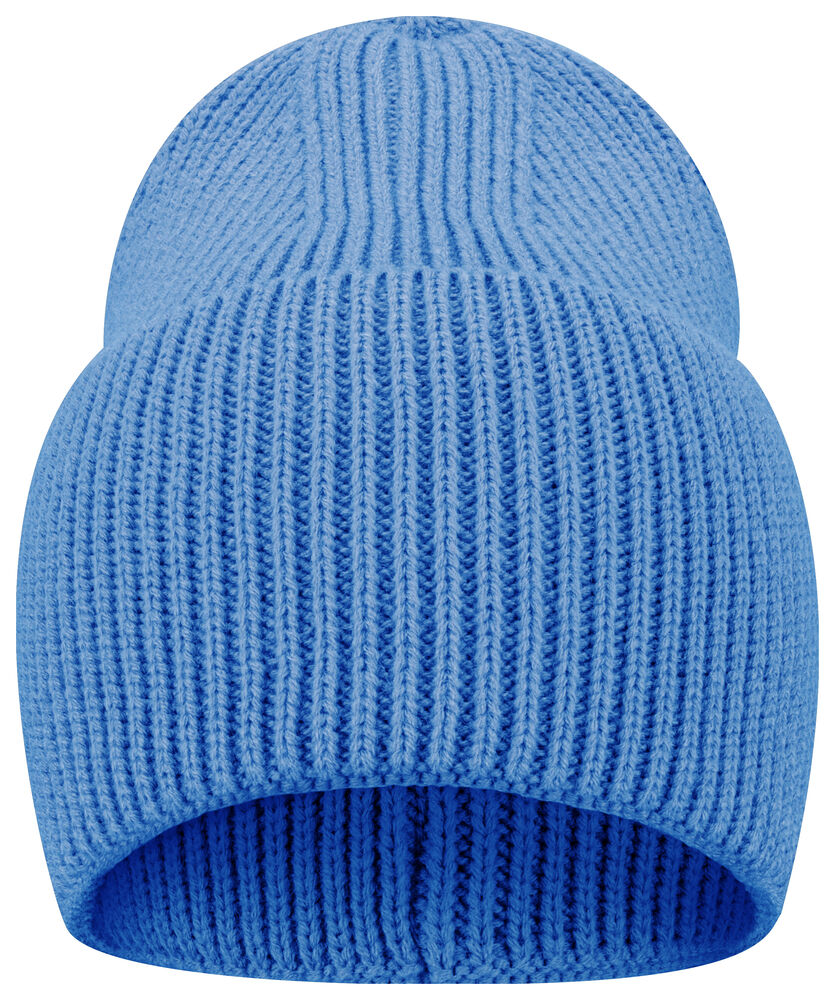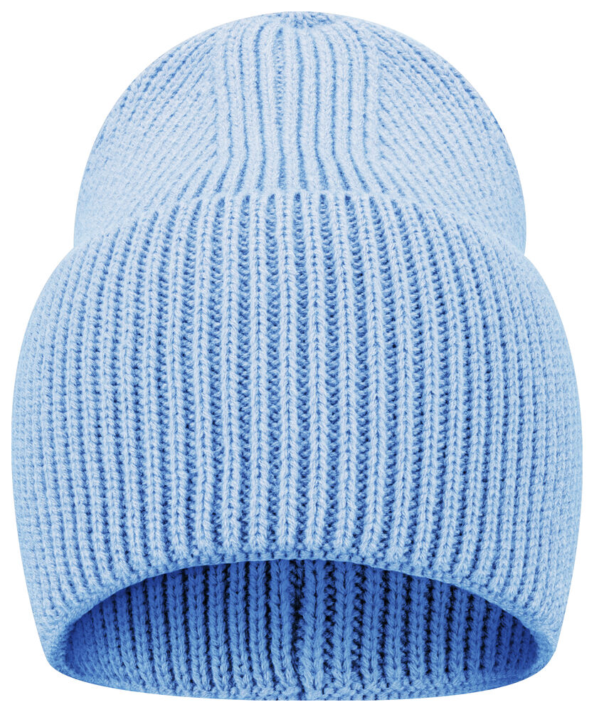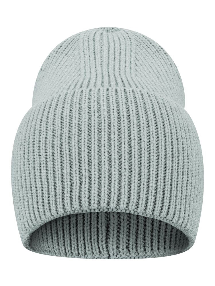Enkelstickad mössa i akryl med smala ribbor. Högt uppvik och 4 dekorativa sömmar i toppen. Mått B21xH24 cm, uppvik: 12 cm. Pris inkl. en brodyr* alt. en vävd etikett*.