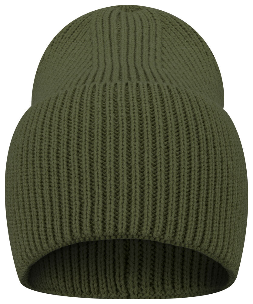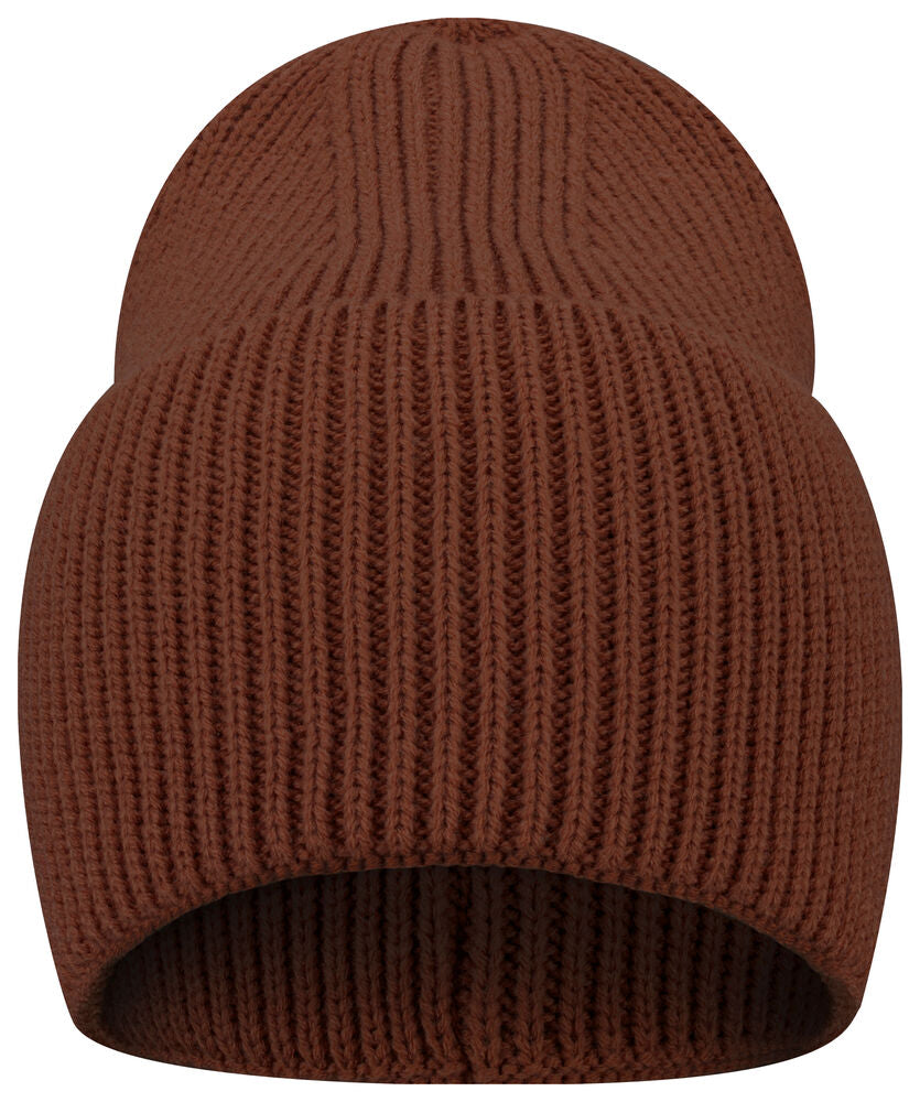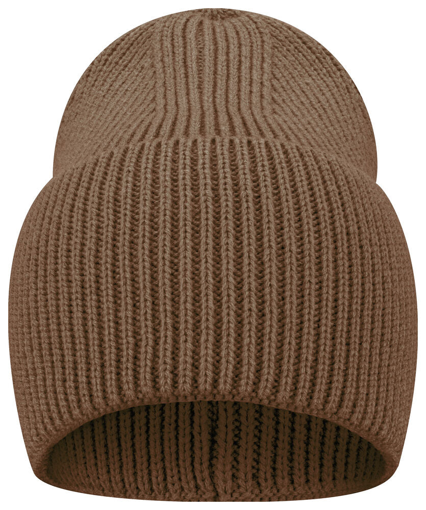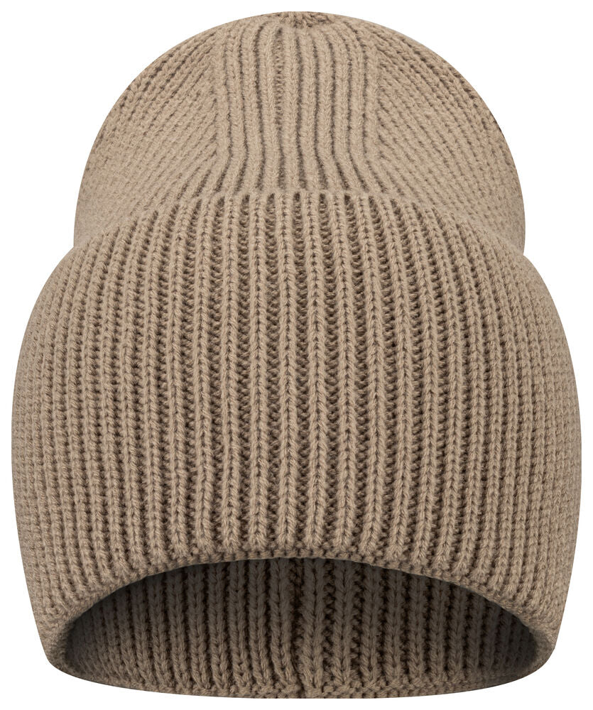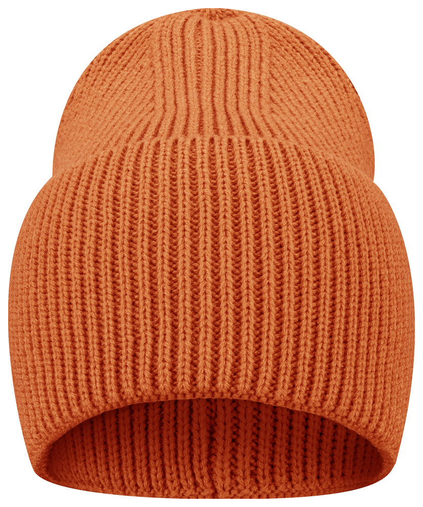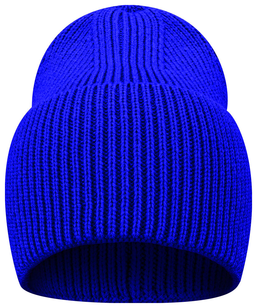 Enkelstickad mössa i akryl med smala ribbor. Högt uppvik och 4 dekorativa sömmar i toppen. Mått B21xH24 cm, uppvik: 12 cm. Pris inkl. en brodyr* alt. en vävd etikett*.