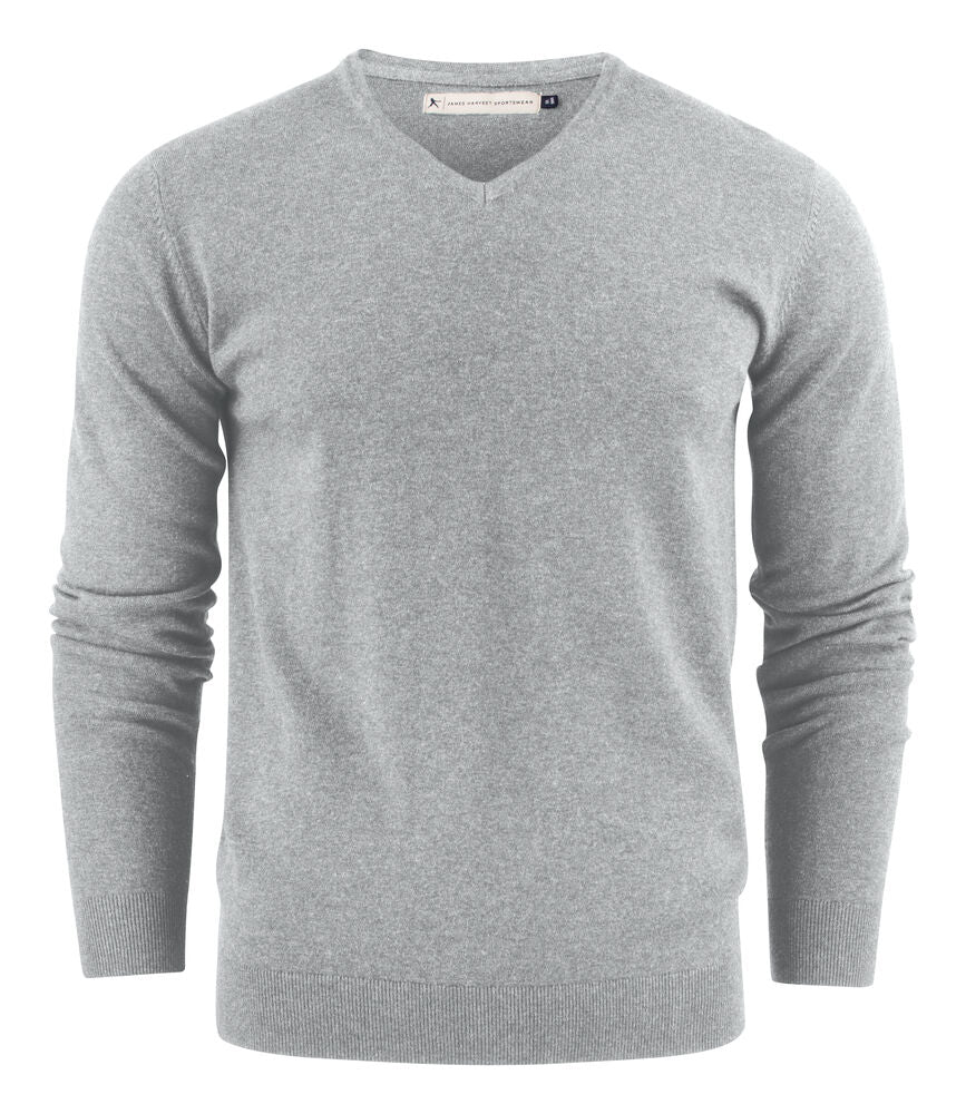 V-ringad finstickad tröja, 1 x 1 rib i nederkant och ärmavslut. Dubbelvikt slätstickad kant i V-ringningen.