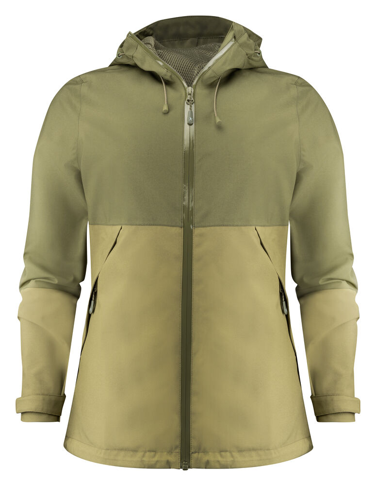 Funktionell, tvåfärgad skaljacka med tejpade sömmar. Vattentät dragkedja framtill och vända nylondragkedjor vid sidfickorna. Kardborrejustering i ärm. Meshfoder med innerficka och broderidragkedja. Reflexettikett mitt bak. Huva och nederkant justerbara med elastiskt snöre.